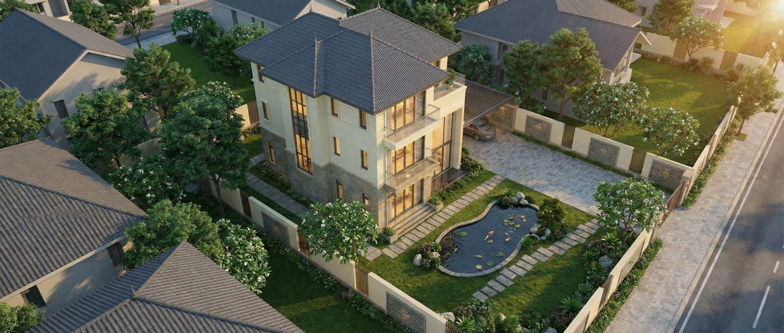Hồ cá Koi phong thủy: Nằm ngay trước hiên nhà với đàn cá đa sắc màu, không chỉ mang lại tài lộc mà còn tạo tiếng nước chảy róc rách vui tai, điều hòa không khí.