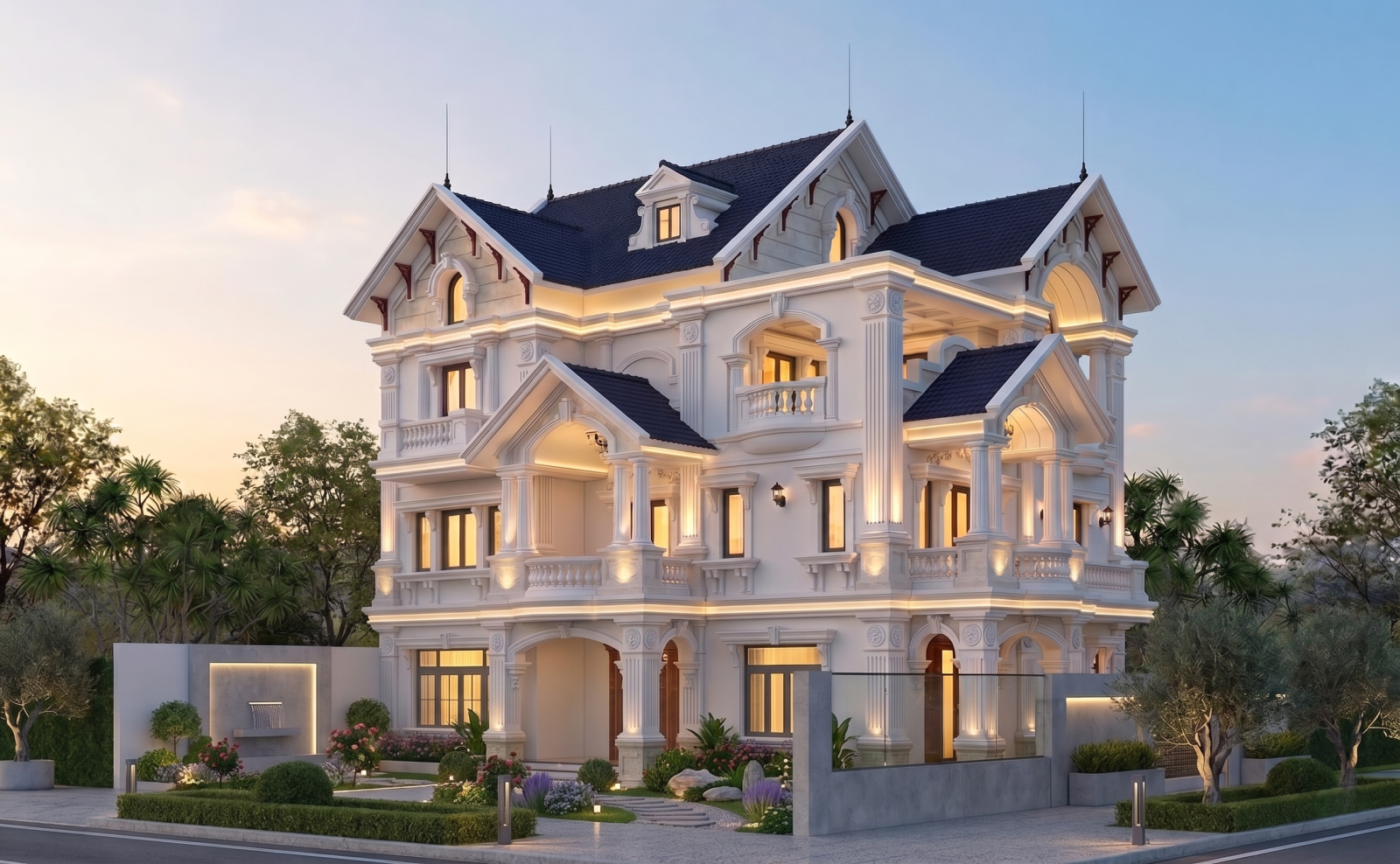 Hệ thống ánh sáng: Được tính toán kỹ lưỡng với dải đèn LED âm tường chạy dọc các đường gờ phào, khiến ngôi nhà trở nên lung linh, huyền ảo như một lâu đài khi màn đêm buông xuống.