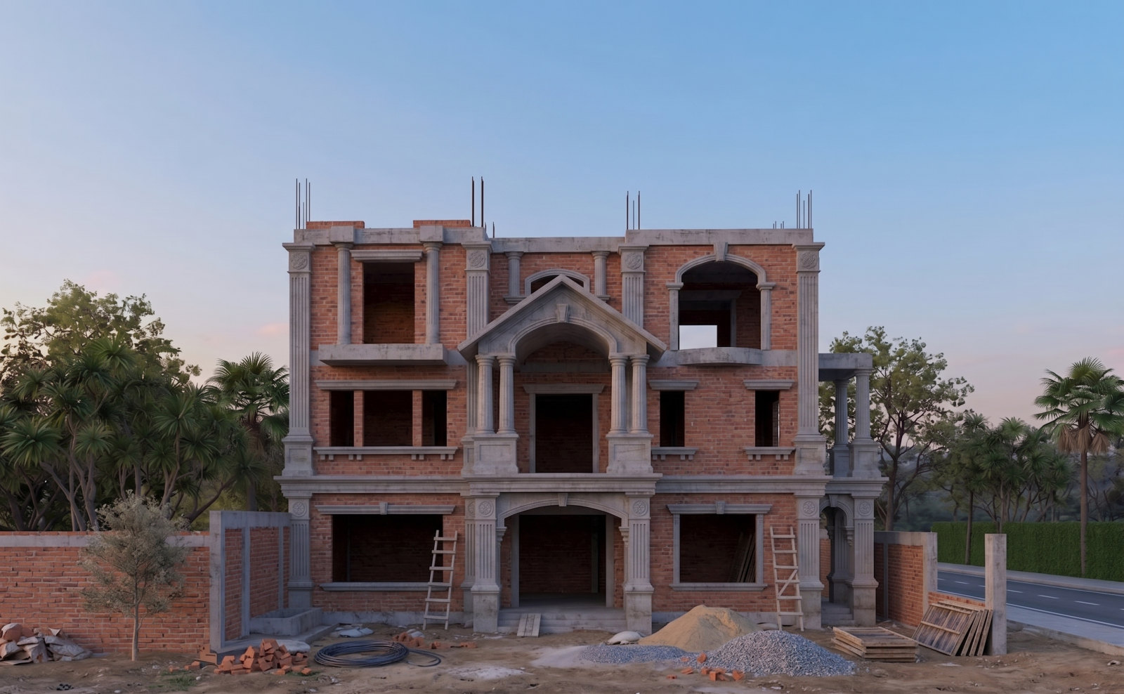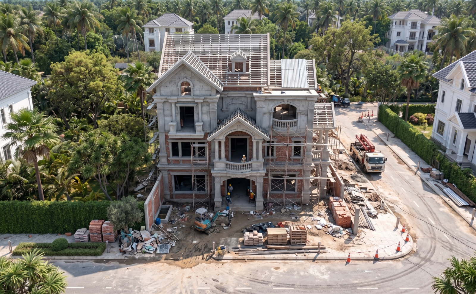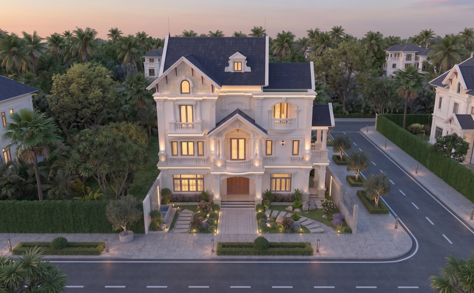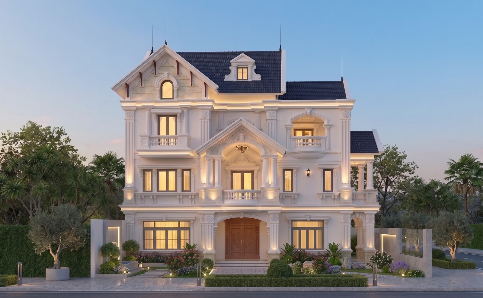 Ngôi biệt thự hiện lên như một dinh thự châu Âu thu nhỏ giữa lòng phố thị. Với sự kết hợp hoàn hảo giữa những đường nét phào chỉ tinh tế và hệ cột trụ uy nghi, công trình mang đến một cảm giác vững chãi nhưng không kém phần mềm mại, uyển chuyển.